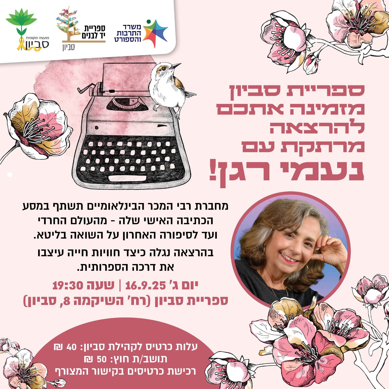 ספריית סביון מזמינה אתכם להרצאה מרתקת עם הסופרת והמחזאית הבין-לאומית נעמי רגן!